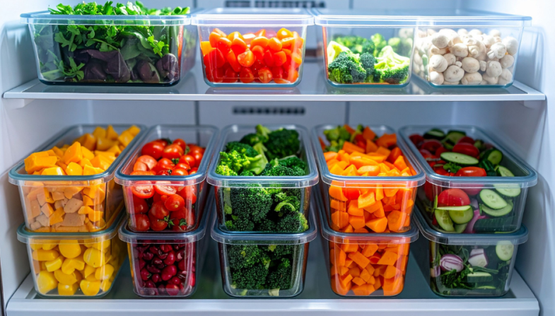 Praktické pomůcky: barevně označená prkénka a nože, uzavíratelné nádoby, potravinové fólie, etikety pro označení data výroby a spotřeby.